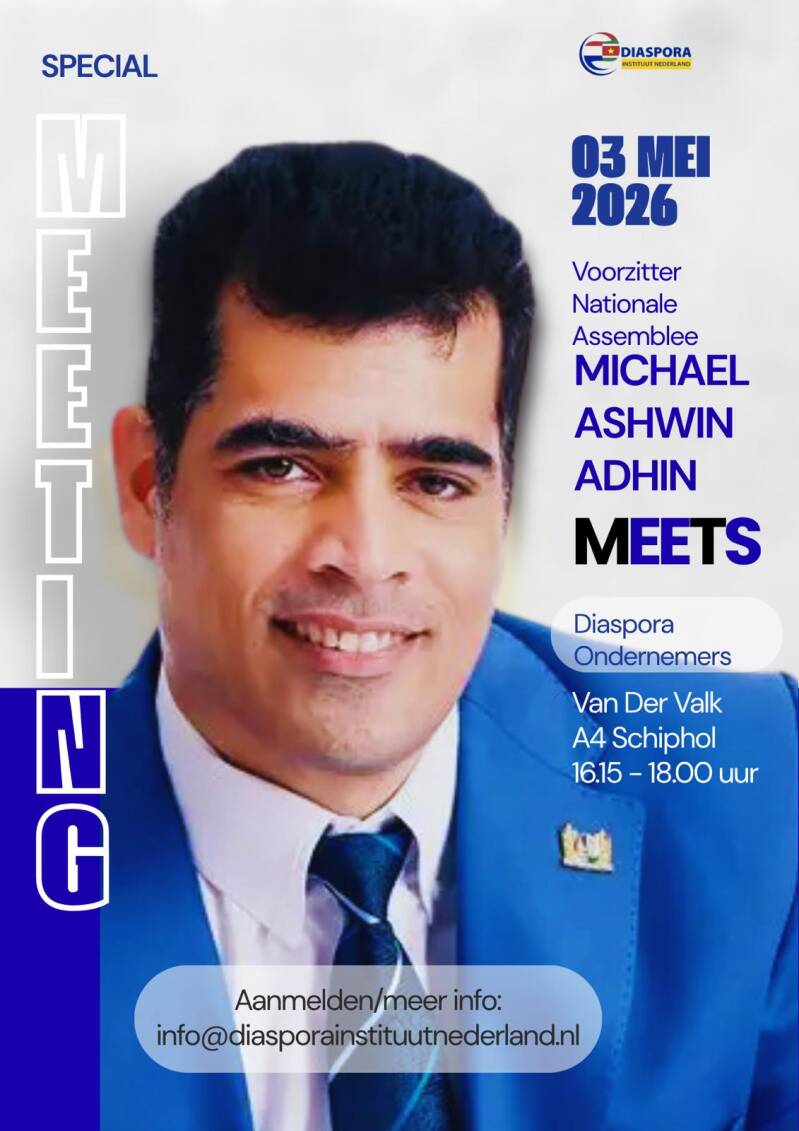 Op zondag 3 mei 2026 krijgen geïnteresseerden een unieke kans om in gesprek te gaan met de voorzitter van De Nationale Assemblee van Suriname, Michael Ashwin Adhin. Deze inspirerende bijeenkomst vindt plaats van 16.15 tot 18.00 uur in het Van der Valk A4 Hotel Schiphol.