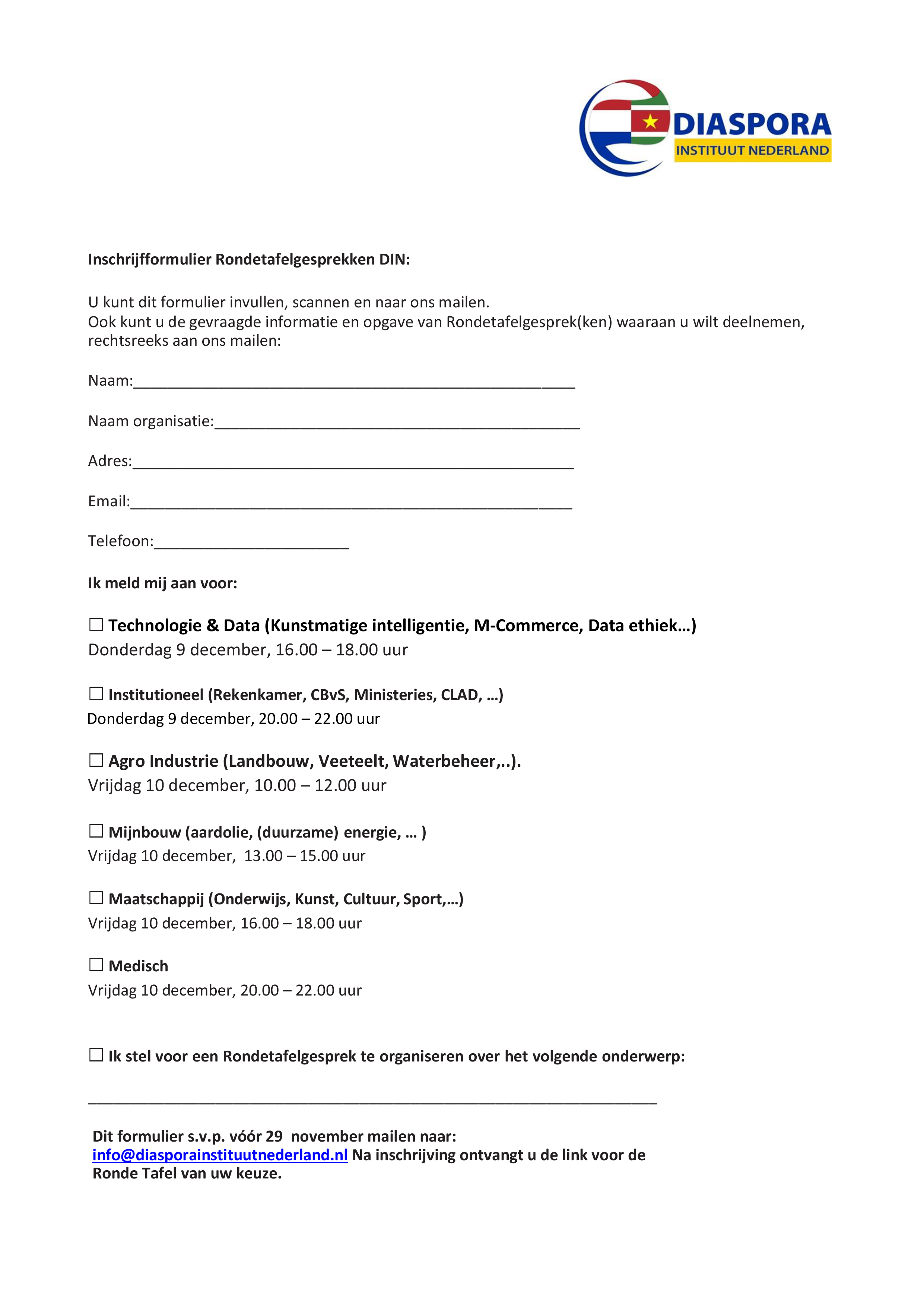 DIN is voornemens in februari of maart een bijeenkomst te organiseren waarbij in ieder geval alle deelnemers, waarbij uiteraard ook anderen vanuit de Diaspora gemeenschap van harte welkom zullen zijn.